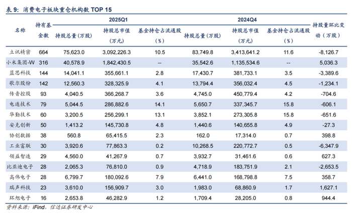消费电子板块:国补政策刺激电子产品需求,重视板块向上修复机会。2025Q1,消费电子板块机构持仓占比4.03%,环比下降0.22pct。从机构持仓角度看,小米集团-W、瑞声科技、领益智造等公司机构持仓增加较多。2025年国家补贴政策升级,增加了对手机等数码产品的消费补贴,有望带动消费电子产品销量提升,同时增加上游零部件等环节的需求,消费电子板块一季度基本面或快速增长。目前多家消费电子大厂力争在其产品上通过AI赋能,这也将刺激需求增长。4月11日美国公布关税豁免清单,其中包括苹果等产品,此前由于关税政策引致果链较大回调,我们建议关注板块估值向上修复的机会。