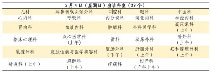 骨伤科、中医科:5月4日、5月5日普通门诊。