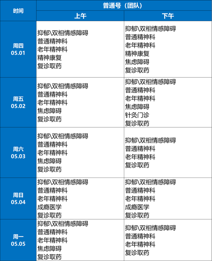 5月2日至5月5日:安排上午半日门诊,专家或普通。