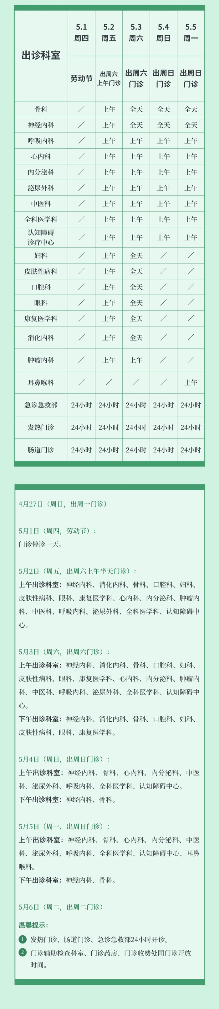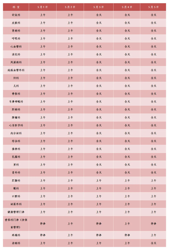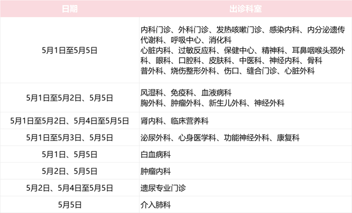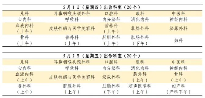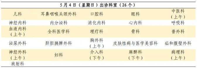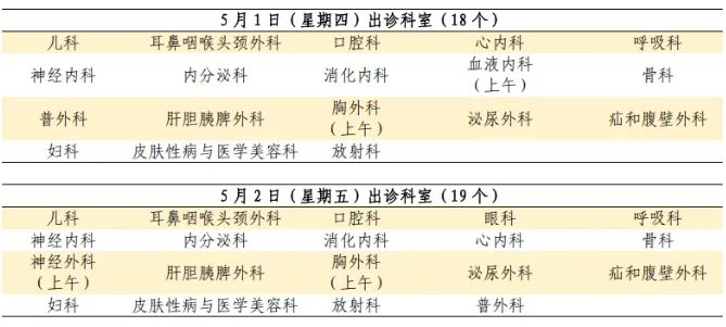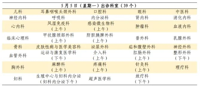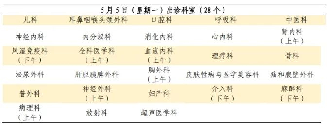 5月1日至5月5日:安排半日门诊,部分专家出诊。