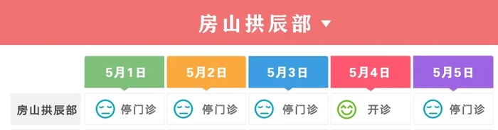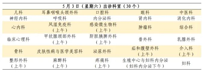 5月3日至5月5日:安排上午半日门诊,儿科全天门诊。