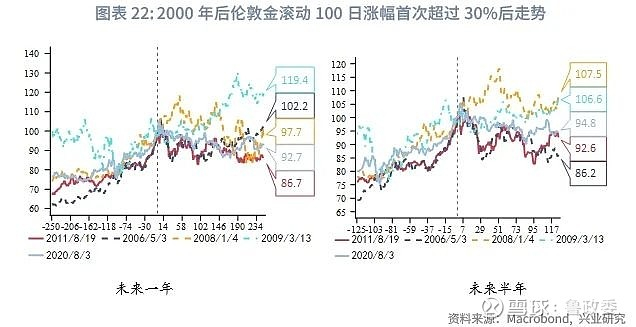 2000年以后,伦敦金100个交易日滚动涨幅超过30%分别发生在2006、2008、2009、2011和2020年。从未来半年和一年的走势来看,金价总体更倾向于走平而非继续上涨。