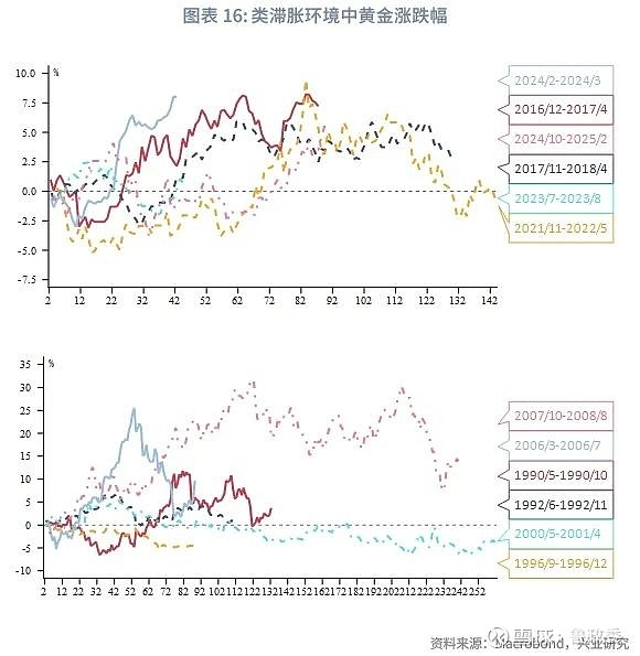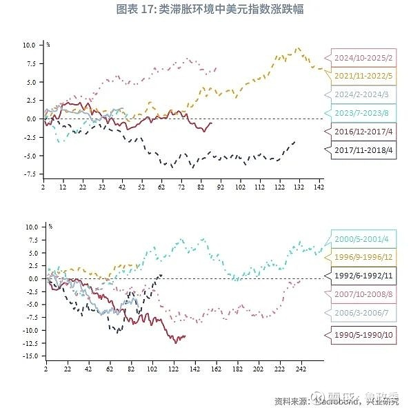 不难发现,在类滞胀环境中黄金总体呈现上涨。进一步统计类滞胀环境区间涨跌幅:次贷危机前后黄金已经处于牛市周期中,当时的类滞胀阶段金价最大涨幅达到25%~30%。其他时期的类滞胀环境中,金价的最大涨幅约为5%~10%。类滞胀环境中黄金的最大跌幅通常不超过5%。另外市场对美元体系的质疑是近期黄金大涨的重要逻辑之一,美元指数和黄金具有较高的负相关性。历史上类滞胀时期美元指数走弱或区间震荡的概率较高,这也会给予金价支撑。