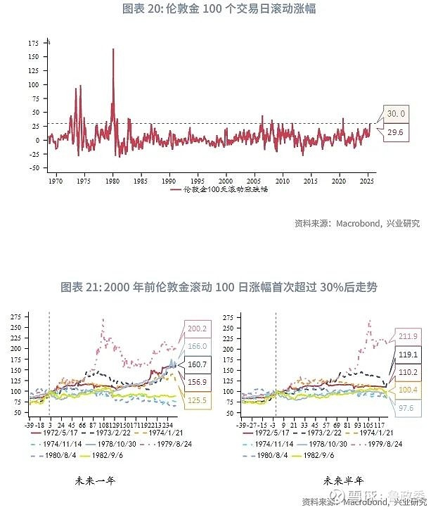 截至2025年4月21日,伦敦金滚动100个交易日涨幅达到29.6%,而在4月22日盘中,伦敦金滚动100个交易日涨幅超过30%。我们讨论1968年以来,伦敦金滚动100个交易日涨幅首次超过30%后的走势规律。