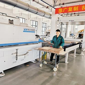 记者跟随叉车走进咏鹊公司,只见在自动化流水线上,一张板材通过龙门上料,并快速切割、精准加工。不到10分钟,这张板材就变成了工艺考究的家具部件。