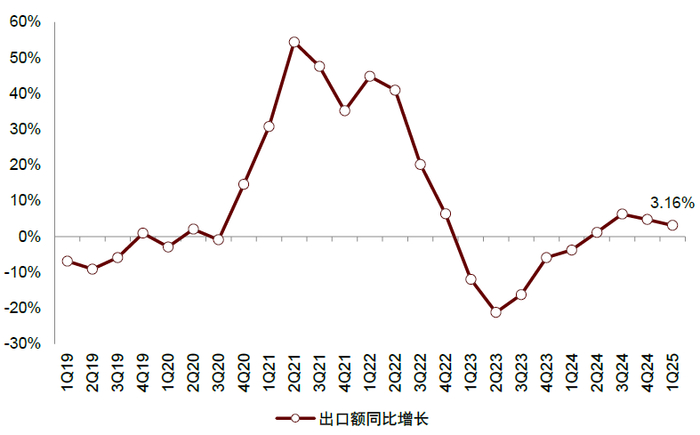 ► 印尼出口市场较为多元化,对美出口敞口较小。2024年,对美出口在印尼整体出口中所占比重仅为10%,美国仅为印尼第三大出口目的地,排在中国大陆(对中国大陆出口在印尼整体出口中所占比重为24%)以及欧盟(对欧盟出口在印尼整体出口中所占比重为20%)之后,在这一点上印尼不同于东盟内受到供应链回流以及“友岸外包”影响、美国为最大出口目的地的其他国家。