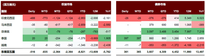 外国资金大幅流出。在本土企业公司治理效率较低引起市场担忧的背景下,截至4月17日,今年年初以来印尼股票市场出现了近30亿美元的大幅外资净流出(2024年股市资金流入为12亿美元),本季度以来印尼债券市场出现了超过3.75亿美元的外资净流出。随着股市和债市持续卖出背景下估值下跌,同时货币贬值压力仍然存在,限制了政策利率的下调空间,我们认为印尼股票市场仍然在持续调整。