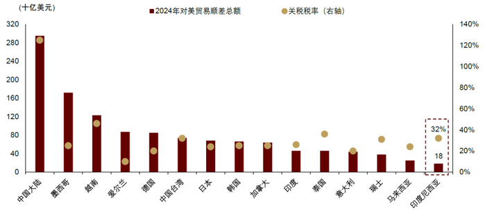 在2024年对美贸易顺差排名前十五位的美国贸易伙伴中,印度尼西亚排在第十五位(对美贸易顺差为180亿美元),美国宣布计划对印度尼西亚征收32%的“对等关税”。但是,我们认为印尼的经济以及资本市场对于美国“对等关税”的风险敞口相对较小,主要原因如下: