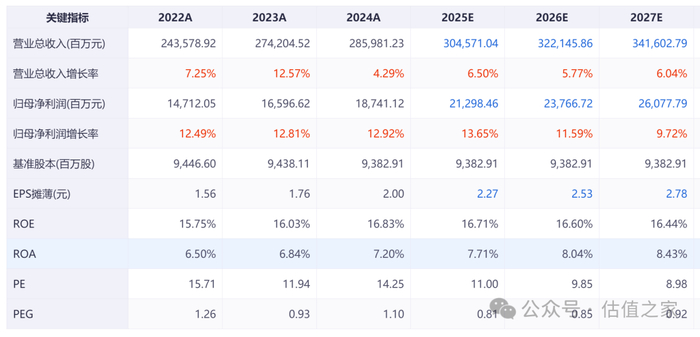 根据机构一致性预测,2025~2027年的营业收入分别为3045.71亿元、3221.46亿元和3416.03亿元,归母净利润分别为212.98亿元、237.67亿元和260.78亿元,PE分别为11、9.85和8.98。机构认为其未来3年营业收入和归母净利润仍将保持增长,并且利润增长速度高于营业收入。