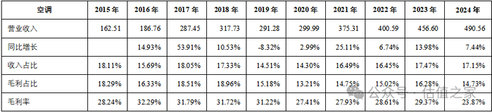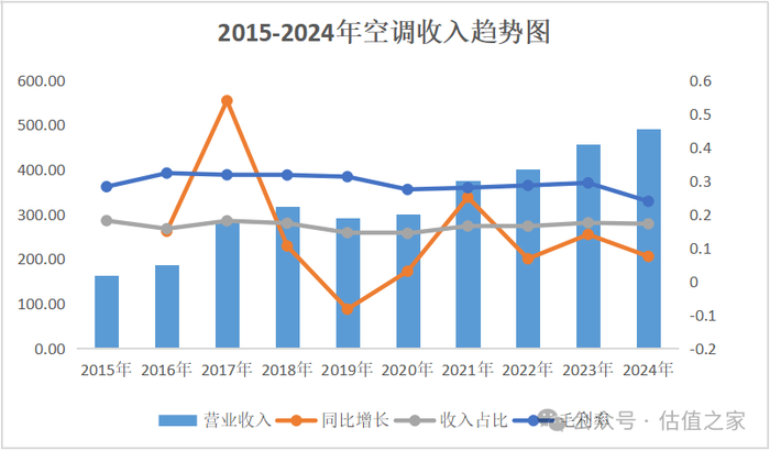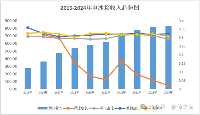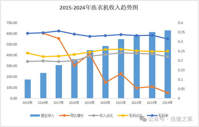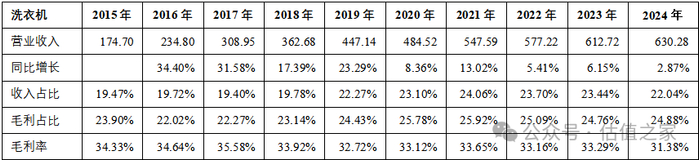 电冰箱:从2015年到2024年,公司电冰箱营业收入从275.89亿元增长2.02倍至832.41亿元,CAGR为13.05%,这些年电冰箱营业收入或大增或小增,它都是公司的第一大业务,收入占比30%左右,毛利占比也是位于30%+,毛利率常年保持在30%+,非常稳定。