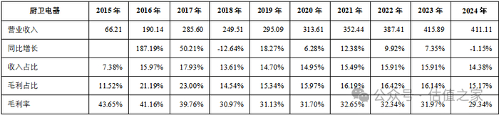 厨卫电器:从2015年到2024年,厨卫电器营业收入从66.21亿元增长5.21倍至411.11亿元,CAGR为22.49%,平均增速高于前三项业务,厨卫电器业务的高速增长期是在2016年和2017年,2018年和2024年略有下降。从毛利率来看,前些年毛利率较高,近些年,毛利率有所下降但整体还算稳定,在30%左右。