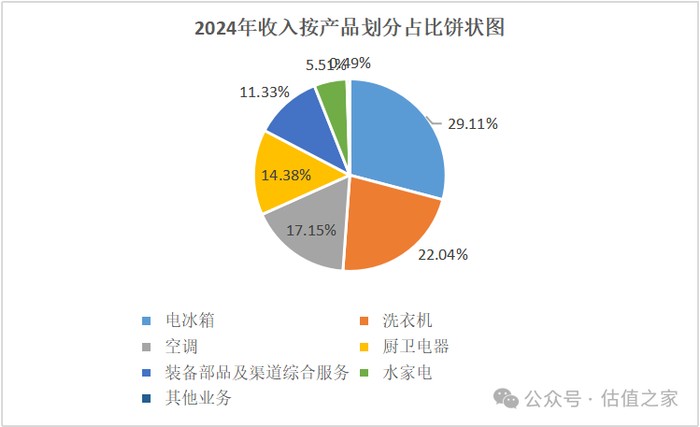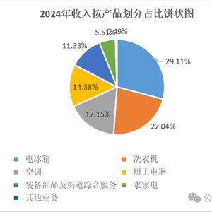 根据海尔智家2024年年度报告数据,按产品分类:电冰箱销售收入832.41亿元,收入占比29.11%;洗衣机销售收入630.28亿元,收入占比22.04%;空调销售收入490.56亿元,收入占比17.15%;厨卫电器销售收入411.11亿元,收入占比14.38%;装备部品及渠道综合服务销售收入323.96亿元,收入占比11.33%;水家电销售收入157.51亿元,收入占比5.51%;其他业务收入13.99亿元,收入占比0.49%。