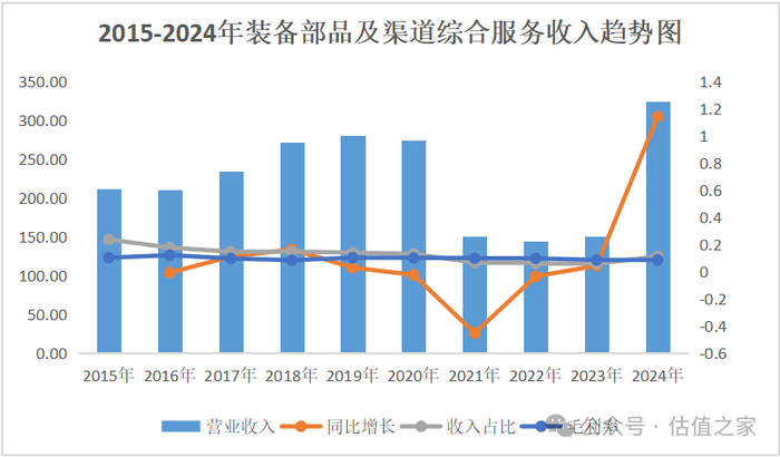 装备部品及渠道综合服务:该业务营业收入从2015年增长53%至2024年的323.96亿元,CAGR为4.80%,平均增速较慢,期间增长和下降幅度均较大,2021年下降45.22%,2024年增长114.26%。该项业务的毛利率和毛利占比相对较低。