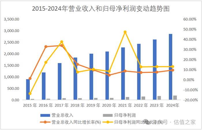 2015年到2024年末,资产总额从759.61亿元增长2.82倍至2,901.14亿元;归母净资产从226.94亿元增长3.91倍至1,113.66亿元。