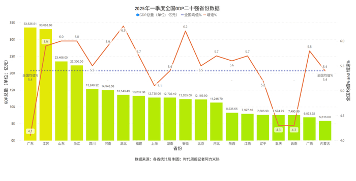 31个省份的一季度GDP数据已经全部公布,至此,全国GDP二十强省份也已揭晓。在这20份成绩单中,15个省份的GDP增速超过或持平全国平均水平(5.4%),展现出较强的增长韧性。