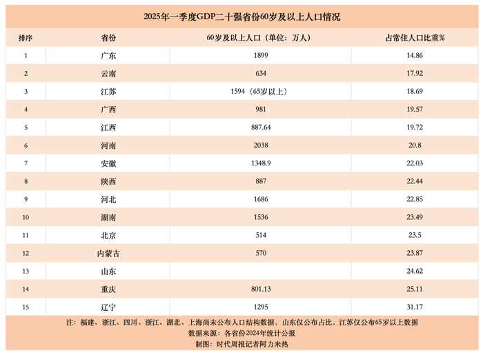 从区域分布来看,在GDP排名前二十的省份中,半数省份的60岁及以上人口占比超过20%,具体包括辽宁、重庆、山东、内蒙古、北京、湖南、河北、陕西、安徽和河南。