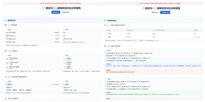 此外,它还能提供多只个股横向分析。比如让它对比分析宠物相关标的股价表现以及在宠物经济赛道的前景,它就会生成一份包含股价客观表现、公司基本面、机构评级、近期公告和事件以及业务前景等方面内容的可视化报告。