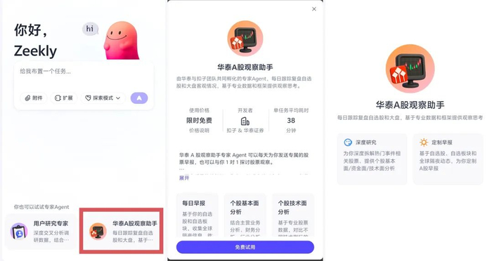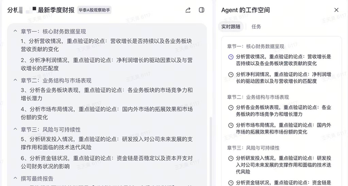 “华泰A股观察助手”由扣子团队与华泰证券联合探索孵化,这个专家Agent在扣子空间通用Agent技术支持的基础上,还引入了华泰证券的专业能力加持,探索实现定制化信息整合。相较于目前市场上同类产品,其着力简化了用户进行市场研究和交叉验证的流程。