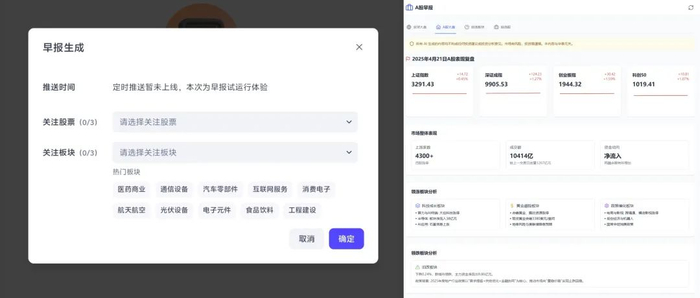 目前,“华泰A股观察助手”支持定制早报和深度研究。定制早报支持用户设置三个自选股及三个自选板块,它会将任务拆解为全球大盘隔夜分析、中国大盘行情分析、自选板块信息收集与分析、自选股客观信息分析以及最终报告撰写六个步骤,经过大约半小时左右,生成一份涵盖主要股指行情、财经事件以及自选板块及个股行情客观信息分析等内容的股市早报。