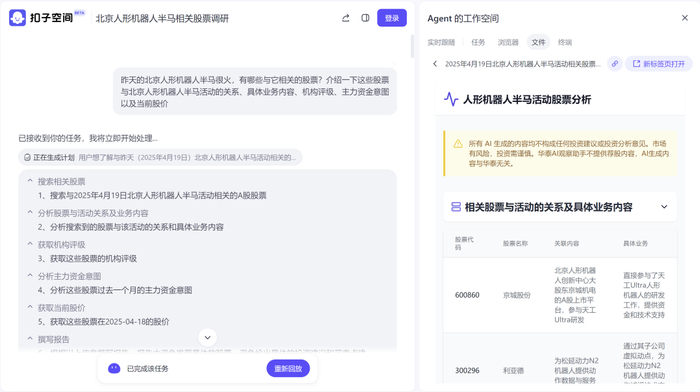 扣子空间探索金融场景AI“搭子”,平台技术与垂类专业buff叠加
