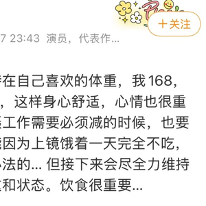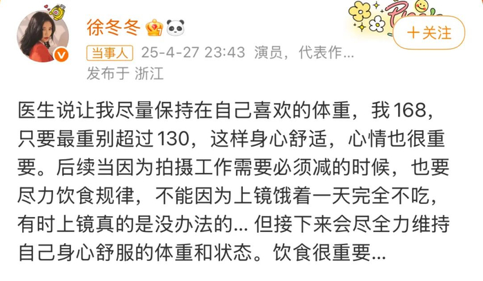 27日,演员徐冬冬在个人社交平台发文表示自己会尽量保持在喜欢的体重:我168,只要最重别超过130,这样身心舒适。