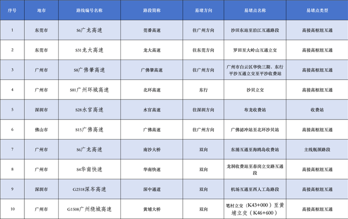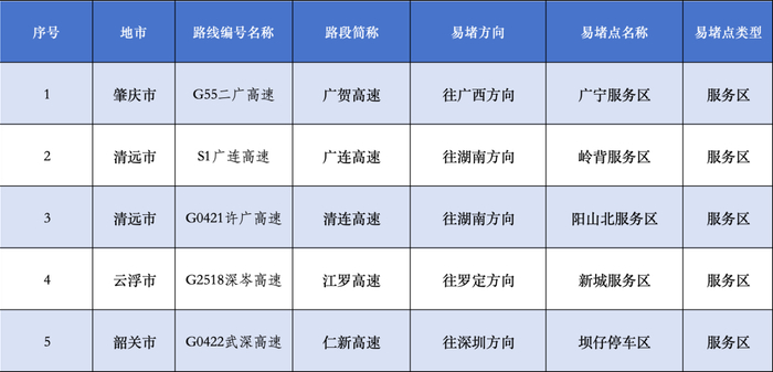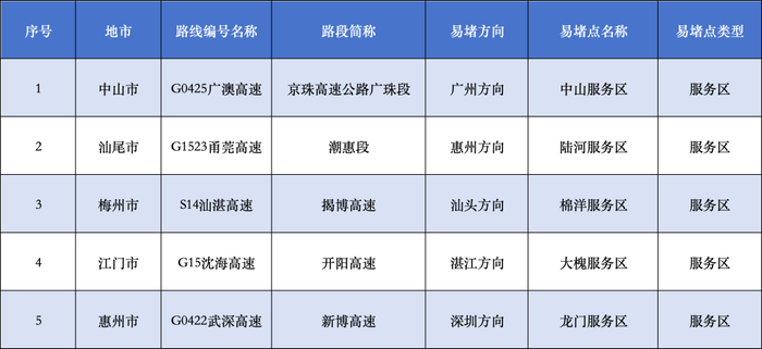 广东“五一”假期易堵点段、繁忙服务区公布