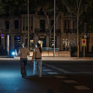 4月28日,在西班牙巴塞罗那,一名女子用手机的手电筒照明穿过人行道。新华社 图