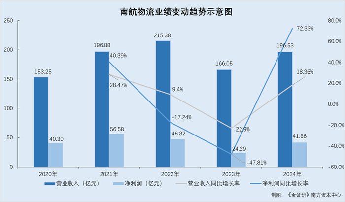 据2023年12月26日招股书及南方航空2023-2024年报,2020-2024年,南航物流的营业收入分别为153.25亿元、196.88亿元、215.38亿元、166.05亿元、196.53亿元;2021-2024年,南航物流的营收增速分别为28.47%、9.4%、-22.9%、18.36%。
