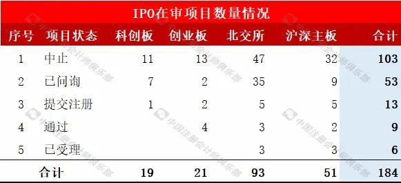 截至2025年4月28日中午,IPO受理审核状态中排队的企业合计有184家,按照审核状态项目数量分析如下: