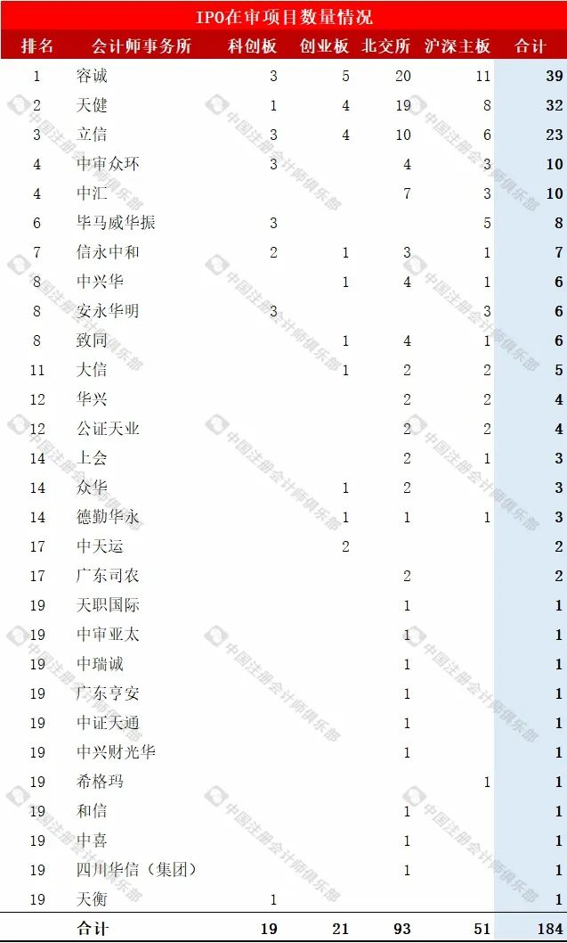 其中,共有29家会计师事务所为目前在审的184家IPO项目提供审计服务。