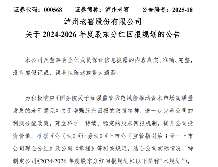 二是机制创新。泸州老窖同步发布的《2024-2026年度股东分红回报规划》,将分红承诺从年度扩展至三年周期(2024-2026年度,公司每年度现金分红比例分别不低于65%、70%、75%),并设置85亿元保底分红,这在白酒行业较为少见。这种“长周期+底线保障”模式,实质是将分红从短期财务安排转向更具系统性的设计机制,强化股东回报的稳定预期。