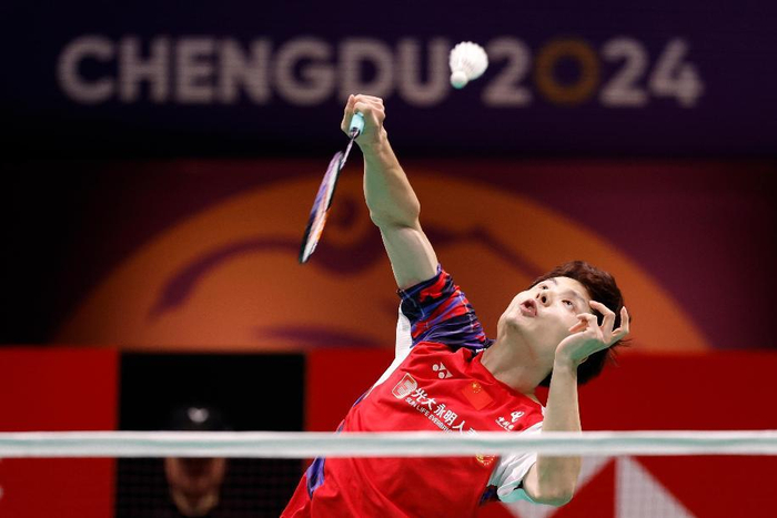 2024年5月5日,在四川成都举行的2024年汤姆斯杯羽毛球团体赛决赛中,中国队选手石宇奇在男子单打比赛中回球。新华社记者 沈伯韩 摄