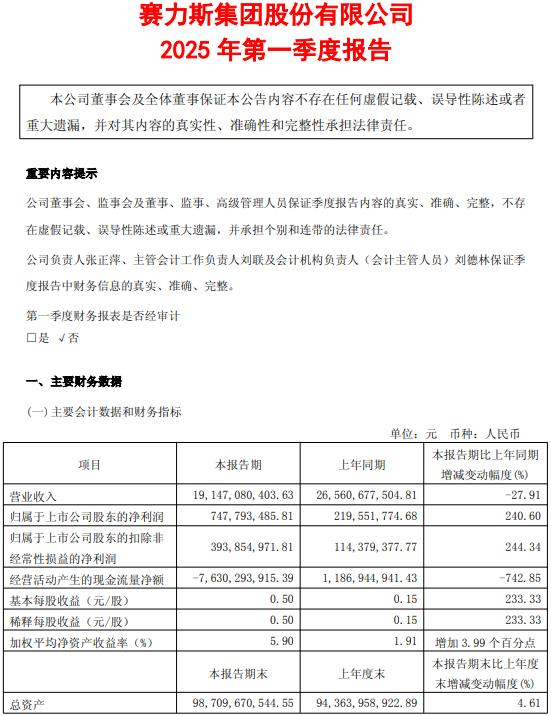 赛力斯公告,2025年第一季度营业收入191.47亿元,同比下降27.91%;归属于上市公司股东的净利润7.48亿元,同比增长240.60%。