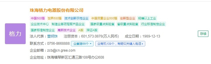 企查猫资料显示,珠海格力电器股份有限公司成立于1989年12月,是中国领先的家电制造企业,总部位于广东省珠海市,注册资金为601,573.0878(万人民币),法人代表是董明珠。格力电器是世界500强、中国500强企业之一。