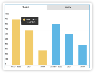 2022年,马士基营收为815亿美元,根据意大利媒体推测,2022年MSC营收达910亿美元,息税前利润约376亿美元,公司现金储备约为664亿美元。