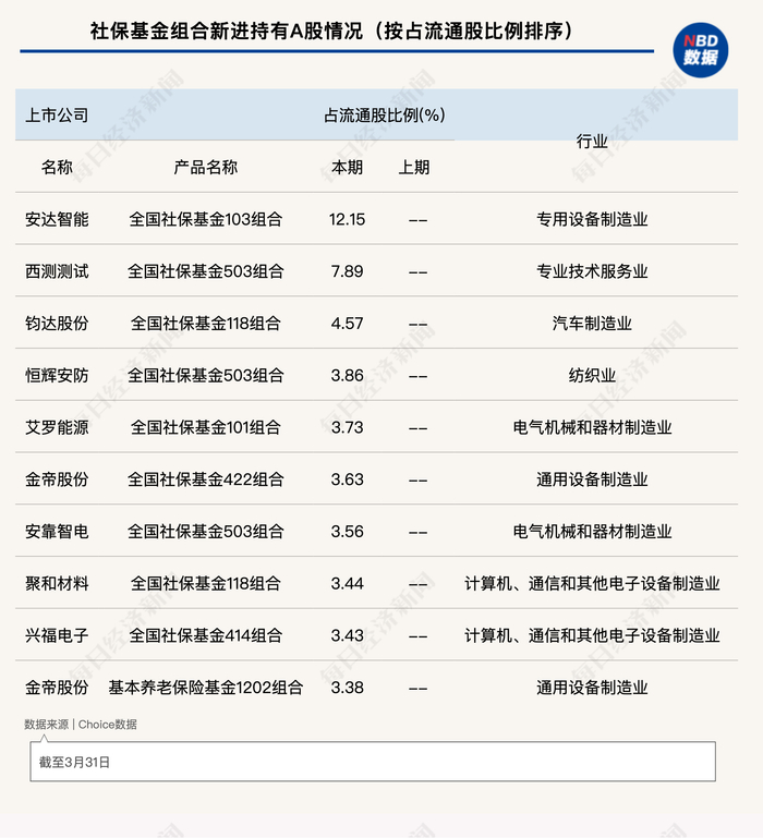 安达智能就是一例。数据显示,全国社保基金103组合一季度持有该股265.16万股,已经占到该公司流通股比例的12.15%。西测测试、钧达股份也分别被全国社保基金503组合、全国社保基金118组合新进持有,占流通股比例分别为7.89%和4.57%,位居前列。