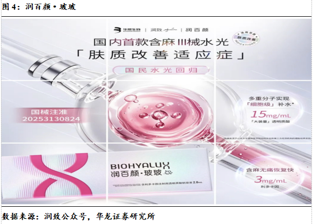 (1)国内首款面部肤质改善适应症的Ⅲ类械水光“润百颜·玻玻”获批。4月25日,华熙生物自主研发的含利多卡因注射用透明质酸钠溶液即“润百颜·玻玻”正式获批Ⅲ类医疗器械证,作为国内首款获批“改善成人皮肤干燥、肤色暗沉”适应症的合规水光产品,以科技赋能美肤体验,针对传统水光产品效果短暂及注射不适等痛点,创新融合水光专研配比的非交联透明质酸与0.3%利多卡因的科学配方,兼顾高效补水和舒适体验。其采用独家Hyature®️超纯注射级HA原料,低致敏且分子渗透率低,实现“细胞级”深层补水,单次注射即可显著提升皮肤含水量,配合疗程效果可持续3个月以上,临床数据显示治疗有效率高达94%。
