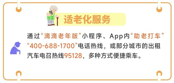 用户可通过“滴滴老年版”小程序、App 内“助老打车”“400-688-1700”电话热线,或部分城市的出租汽车电召热线 95128,利用多种方式便捷乘车。