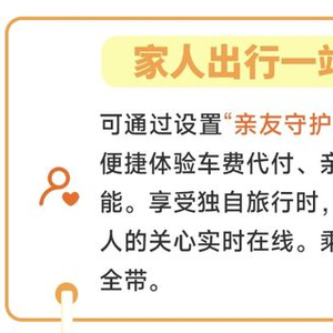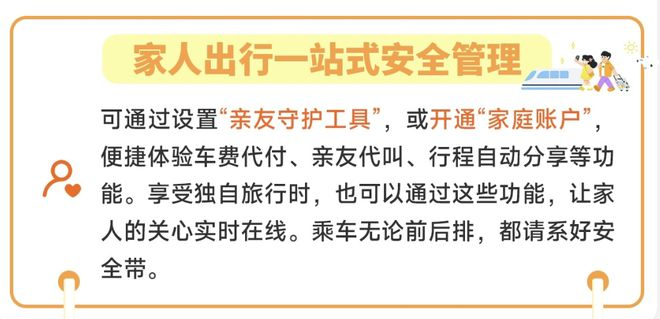 用户可通过设置“亲友守护工具”,或开通“家庭账户”,便捷体验车费代付、亲友代叫、行程自动分享等功能。享受独自旅行时,也可以通过这些功能,让家人的关心实时在线。乘车无论前后排,都请系好安全带。