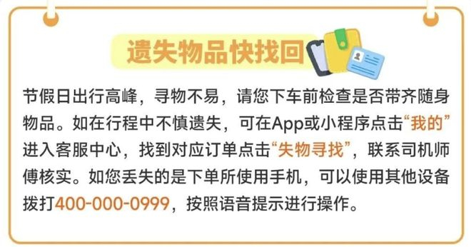 节假日出行高峰,寻物不易,用户下车前需检查是否带齐随身物品。如在行程中不慎遗失,可在 App 或小程序点击“我的”进入客服中心,找到对应订单点击“失物寻找”,联系司机师傅核实。如用户丢失的是下单所使用手机,可以使用其他设备拨打 400-000-0999,按照语音提示进行操作。