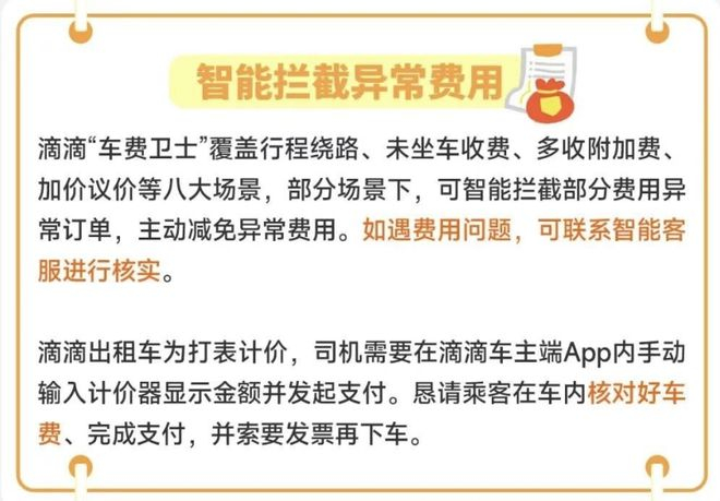 滴滴“车费卫士”覆盖行程绕路、未坐车收费、多收附加费、加价议价等八大场景,部分场景下,可智能拦截部分费用异常订单,主动减免异常费用。如遇费用问题,可联系智能客服进行核实。