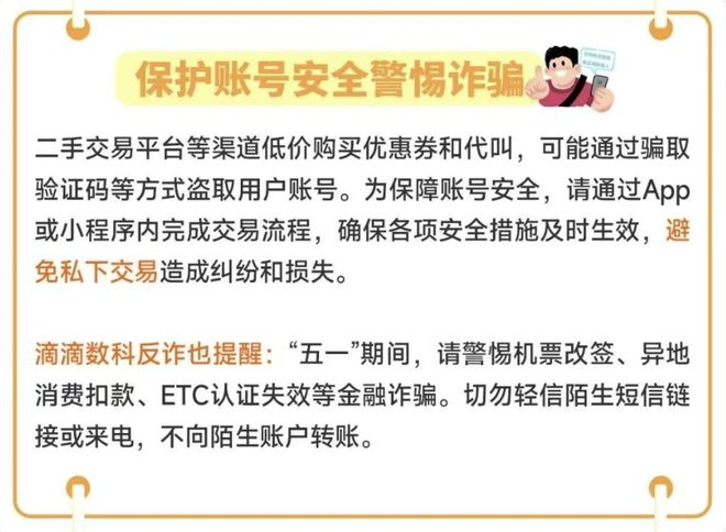 二手交易平台等渠道低价购买优惠券和代叫,可能通过骗取验证码等方式盗取用户账号。为保障账号安全,请通过 App 或小程序内完成交易流程,确保各项安全措施及时生效,避免私下交易造成纠纷和损失。