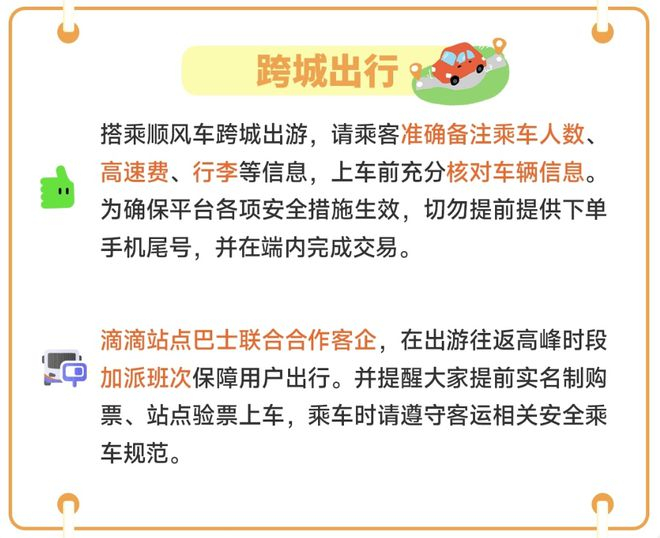 此外,用户在搭乘顺风车跨城出游时,应准确备注乘车人数、高速费、行李等信息,上车前充分核对车辆信息。为确保平台各项安全措施生效,切勿提前提供下单手机尾号,并在客户端内完成交易。