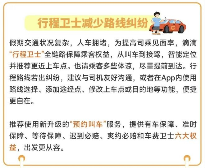 假期交通状况复杂,人车拥堵,为提高司乘见面率,滴滴“行程卫士”全链路保障乘客权益,从叫车到接驾,智能定位并推荐更近上车点。也请乘客多些体谅,尽量提前到达。行程路线若出纠纷,建议与司机友好沟通,或者在 App 内使用路线选择、添加途经点、修改上车点或目的地等功能。