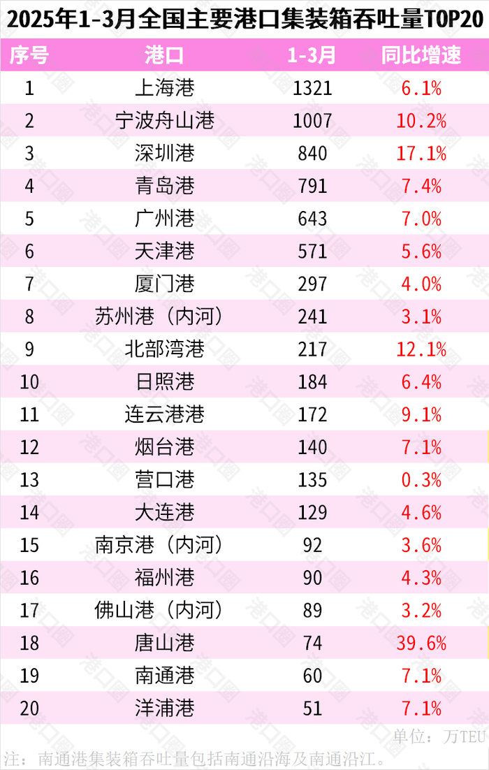 1-3月全国主要港口货物吞吐量前十名为:宁波舟山港(第1)、唐山港(第2)、上海港(第3)、青岛港(第4)、日照港(第5)、广州港(第6)、苏州港(第7)、天津港(第8)、烟台港(第9)、北部湾港(第10)。其中苏州港上升1名,位列榜单第7;福州港排名上升2名,位列榜单第13。