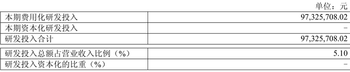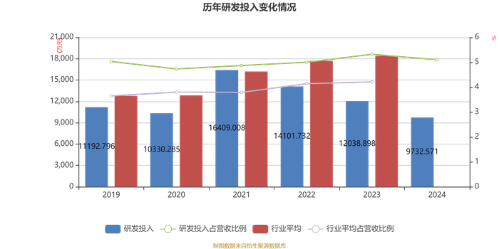 2024年全年,公司研发投入金额为9732.57万元,同比下降19.16%;研发投入占营业收入比例为5.1%,相比上年同期下降0.22个百分点。此外,公司全年研发投入资本化率为0%。