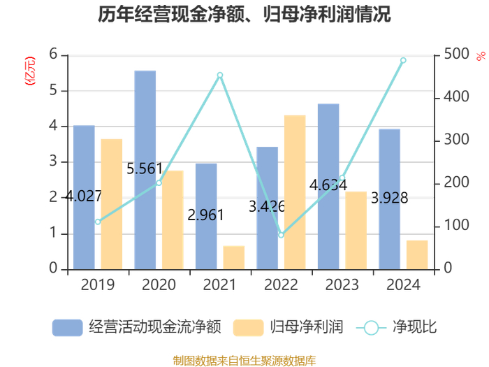 截至2024年,公司经营活动现金流净额为3.93亿元,同比下降15.23%;筹资活动现金流净额-9699.34万元,同比增加7543.28万元;投资活动现金流净额-2.88亿元,上年同期为-6071.61万元。