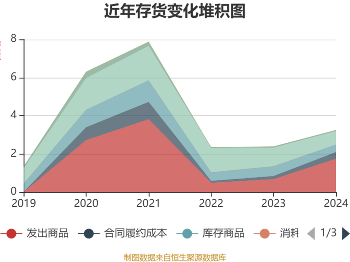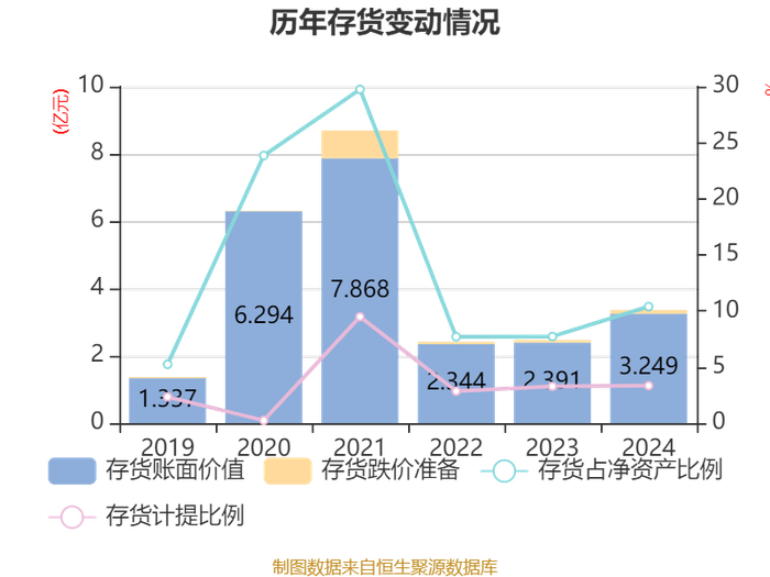 从存货变动来看,截至2024年末,公司存货账面价值为3.25亿元,占净资产的10.39%,较上年末增加8585.61万元。其中,存货跌价准备为1122.36万元,计提比例为3.34%。