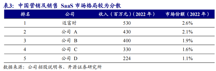 营销及销售SaaS市场格局较为分散,公司是中国最大的营销及销售 SaaS 解决方案提供商。根据弗若斯特沙利文的资料,按2022 年的收入计算,公司是中国最大的营销及销售 SaaS 解决方案提供商,2022年SaaS业务的收入为5.30亿元,占市场份额的2.6%。
