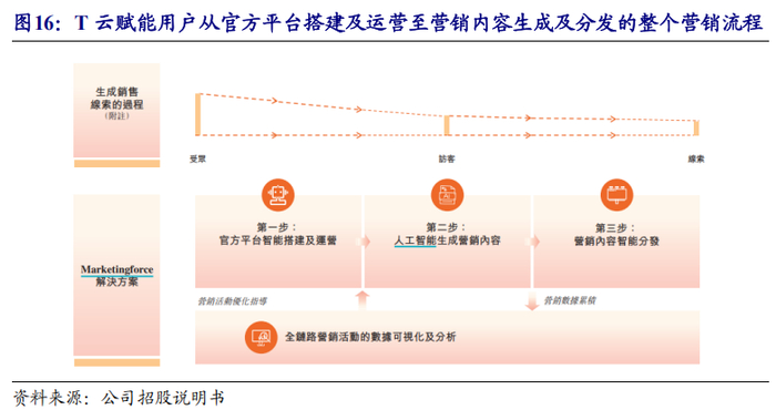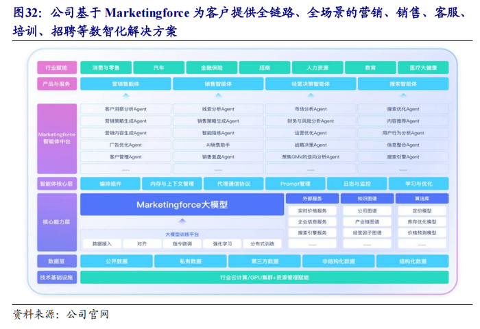 公司基于Marketingforce为客户提供全链路、全场景的营销、销售、客服、培训、招聘等数智化解决方案。2024年5月16日,Marketingforce正式发布Tforce营销领域大模型,并在后续发布了Al-Agentforce智能体中台,打造了营销智能体,销售智能体,经营决策智能体,搜索智能体等场景应用,为客户提供全链路、全场景的营销、销售、客服、培训、招聘等数智化解决方案。2025年2月,Marketingforce迈富时宣布AI Agent产品全面接入DeepSeek-V3和DeepSeek-R1,将其融合至AI-Agentforce中台,为企业客户打造更具创新性与竞争力的智能化营销销售全链路解决方案。